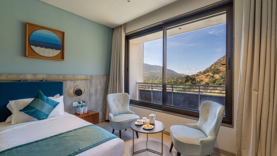 Our Deluxe Room in Kumbhalgarh, encompassing 350 sq. ft., combines contemporary design with comfort to provide an inviting retreat. Designed to accommodate up to 2 adults and 2 children, this room offers essential amenities such as a flat-screen TV for entertainment. The well-appointed space features stylish furnishings and a cosy ambience, making it perfect for a relaxed stay. Guests can enjoy a comfortable night’s sleep in a thoughtfully designed environment.